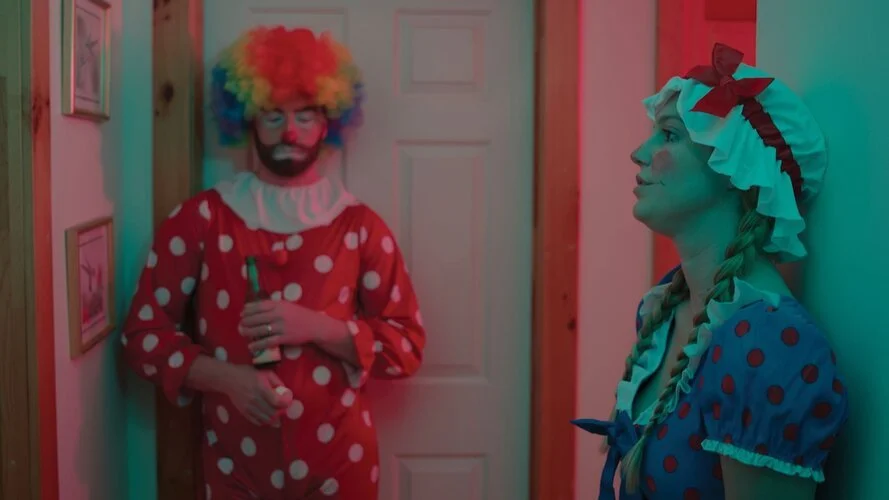 The film flits about in time, taking us back to when Hayes and gf met, to the night of the party, to years previously when Hayes had the bright idea of laying down plastic sheeting when throwing his Halloween parties. It’s a very dynamic way of developing the characters and set up some sight gags (such as the fate of Hayes' blue shirt). My only issue with this is that the countdown clock ticking down to the moment of gf's death is repeated so often it does become annoying after while.